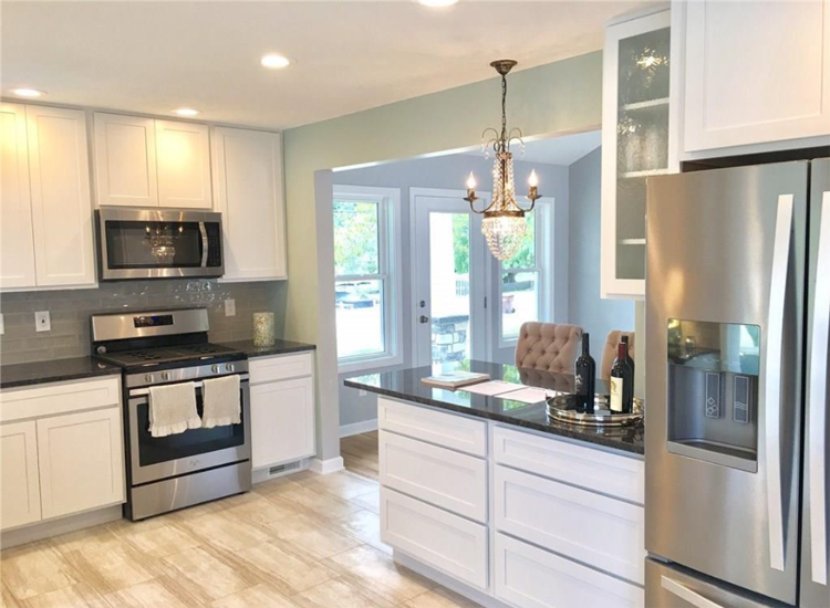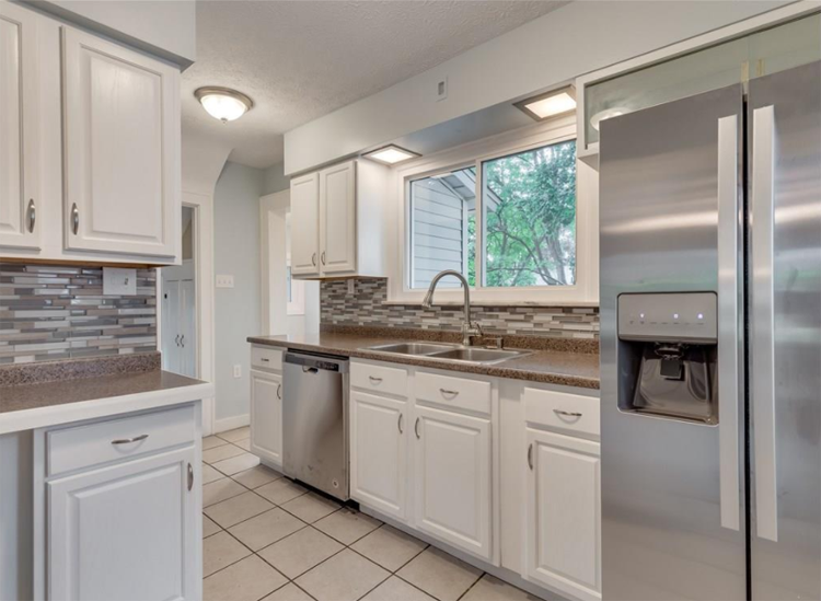This stunning home in Canton is as beautiful inside as it is outside — just look at this kitchen! The white cabinetry works off of the neutral backsplash, which complements the granite countertops. A warm hardwood floor brings it all together for an eclectic yet inviting look!