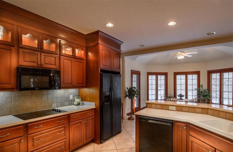 The vibrant warm cabinetry in this home is enough to draw anyone in, but you'll also be drawn to the striking black appliances and the grey backsplash. Mixing colors and materials works well in this kitchen! The same elegance found here can be found throughout the four-bedroom home.A Rustic Country Vibe